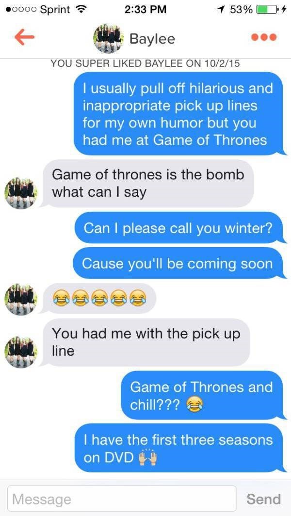 Write Tinder pickup lines that actually work. See more ideas about pick up lines tinder humor funny texts. If a message looks like it could be inappropriate the app will show users a prompt that asks them to think twice before hitting send.